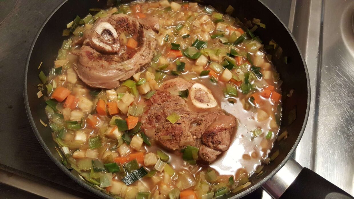 Man würzt 2 Stück Kalbshaxen, ca. je 250 gr schwer, mit Fleischgewürz. Dann brät man sie auf beiden Seiten an. Man gibt sie in einen Topf. Im selben Öl wie die Haxen dämpft man danach die Gemüsewürfel an, gibt das Tomatenpüree dazu, löscht mit Weisswein ab. Man gibt das Gemüse über die Haxen, füllt mit Gemüse- oder Fleischbrühe auf. Man lässt das Ganze leise köcheln, bis das Fleisch gar ist und fast vom Knochen fällt. Ca. 1,5 Stunden. Sauce probieren, ev. nachwürzen, ev. abbinden.
