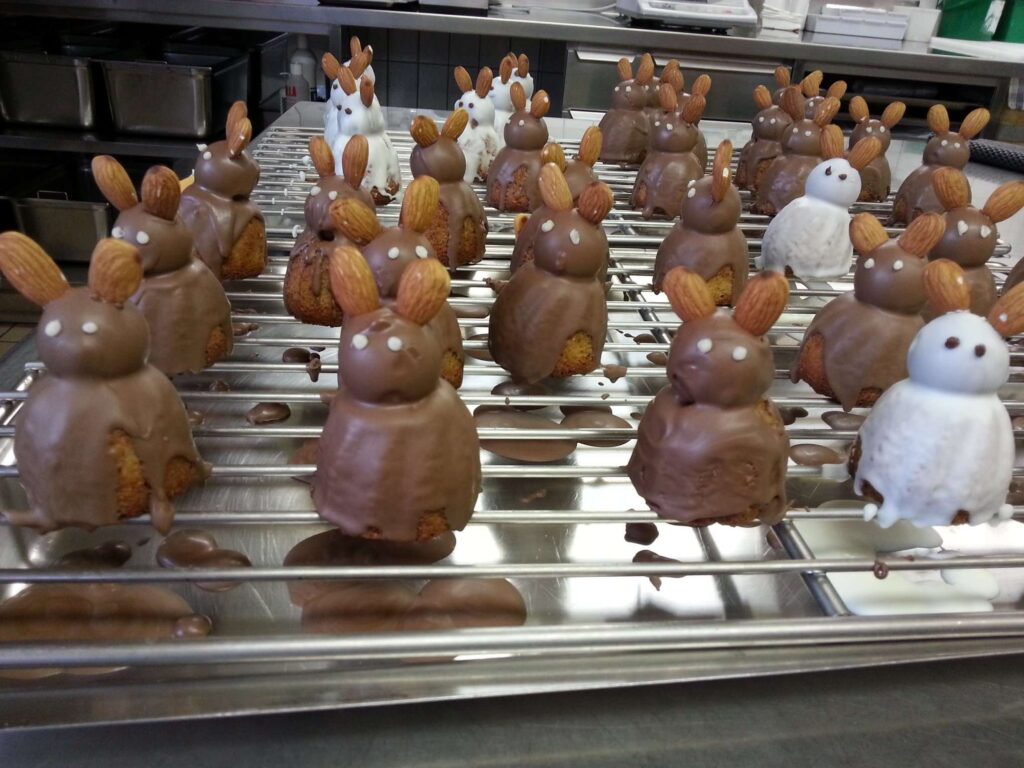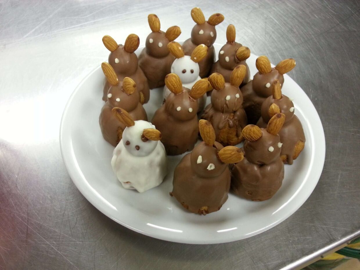 Schokoladen- oder Nussgugelhöpfchen backen, erkalten lassen. Schokoladenkugel (z. B. Lindorkugel) auf das Gugelhöpfchen legen, mit flüssiger Schokoladenglasur übergiessen, sofort 2 Mandeln als Ohren in die Kugel stecken. Mit weisser Schokoladenglasur die Augen markieren.