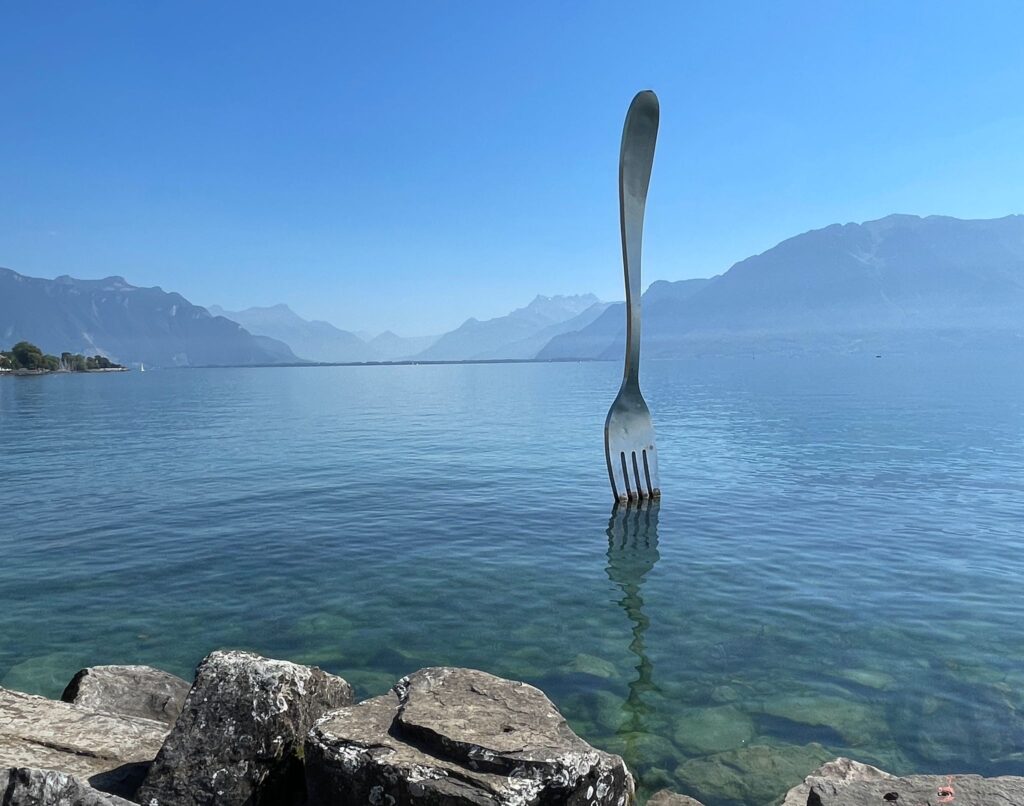 Die Gabel, Jean-Pierre Zaugg schuf das Kunstwerk 1995 zum 10jährigen Jubiläum des Museums Alimentarium. Nach einer Odyssee fand es 2007 wieder den ursprünglichen Platz im Genfersee.