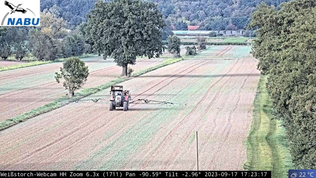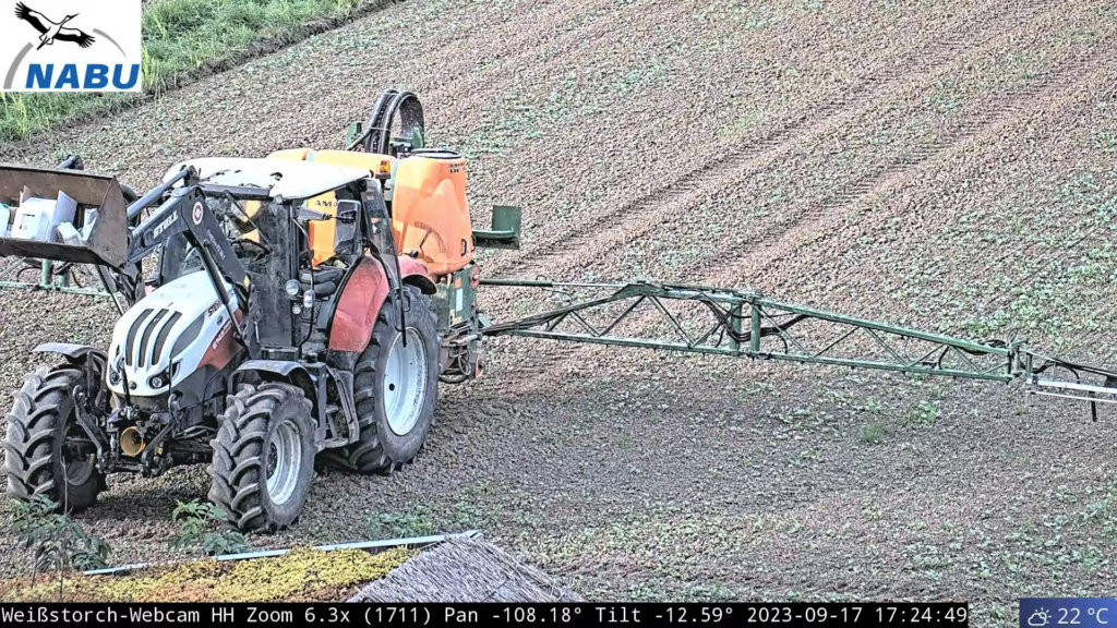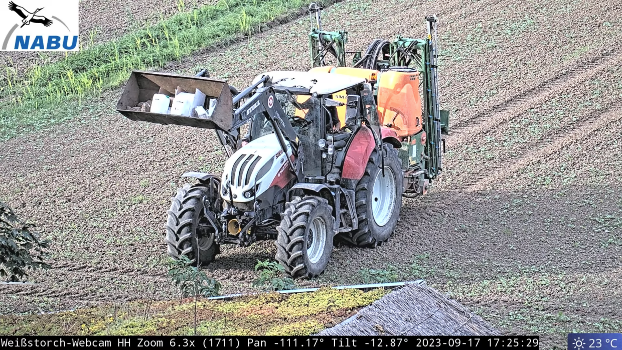 Men at Work Steyr-Traktor beim Ausbringen von Pflanzenschutzmitteln Curslack Hamburg DE 17.09.2023