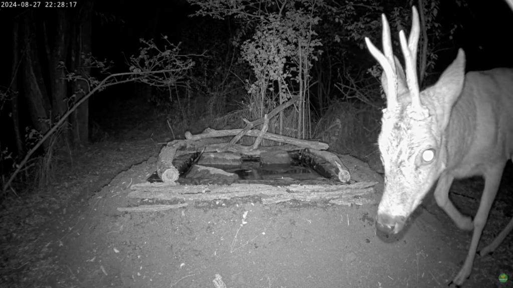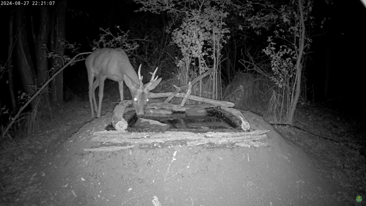 Das Tier mit dem kleineren Gehörn ist rechtsseitig blind, daher spiegelt sich das Infrarotlicht hier nicht wie üblich im Tapetum lucidum.
